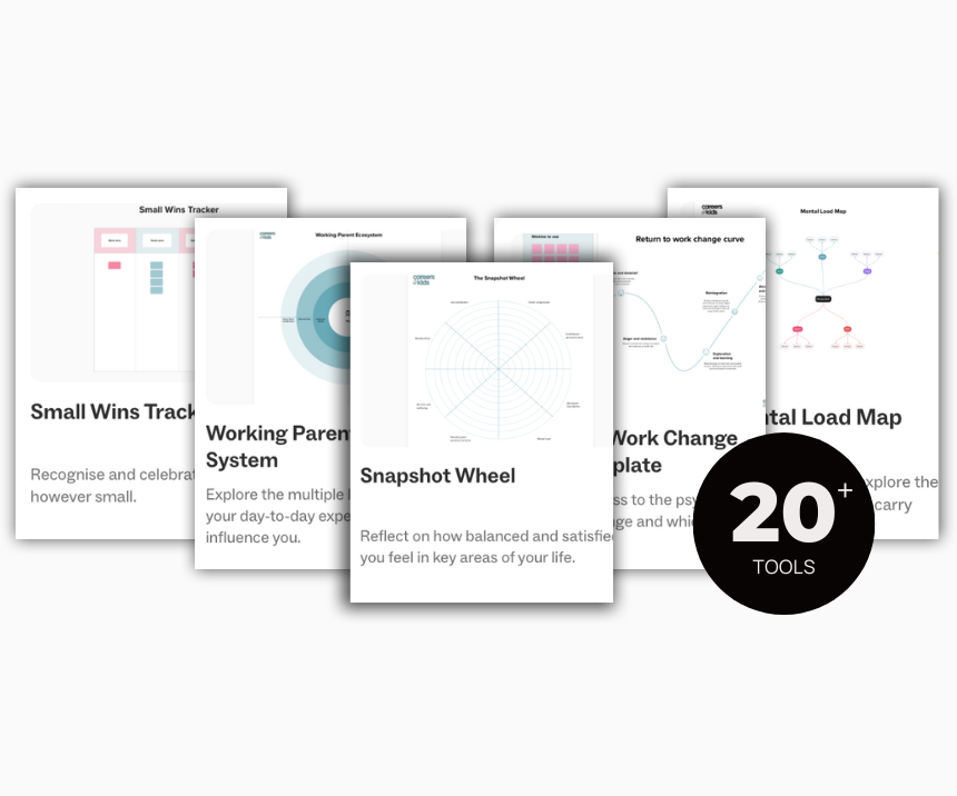 Our bespoke set of over 20 coaching tools has been developed in-house by us, using proven coaching methods, workplace psychology, and insights from over 300 real-life coaching journeys. Created specifically for working parents, our interactive, virtual tools elevate our coaching conversations and enable true collaboration between coach and client.